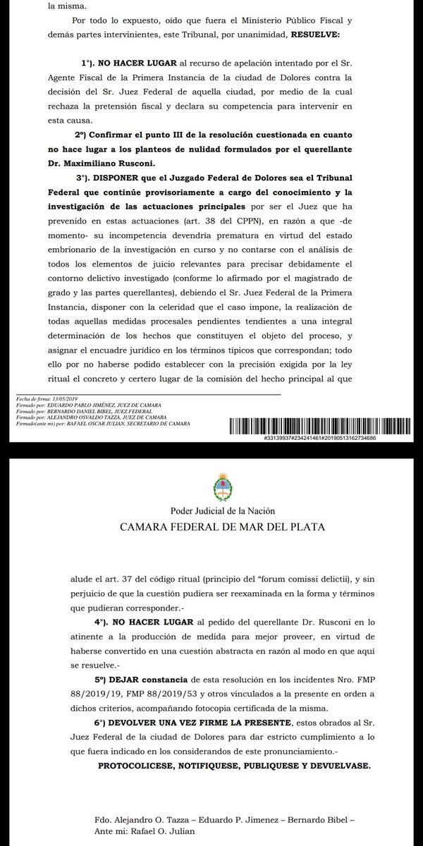 El tribunal de apelaciones, integrado por los jueces Alejandro Tazza, Eduardo Jiménez y Bernardo Bibel, señaló que “el Juzgado Federal de Dolores sea el Tribunal Federal que continúe provisoriamente a cargo del conocimiento y la investigación de las actuaciones principales por ser el Juez que ha prevenido en estas actuaciones (art. 38 del CPPN), en razón a que -de momento- su incompetencia devendría prematura en virtud del estado embrionario de la investigación en curso y no contarse con el análisis de todos los elementos de juicio relevantes para precisar debidamente el contorno delictivo investigado (conforme lo afirmado por el magistrado de grado y las partes querellantes)”.