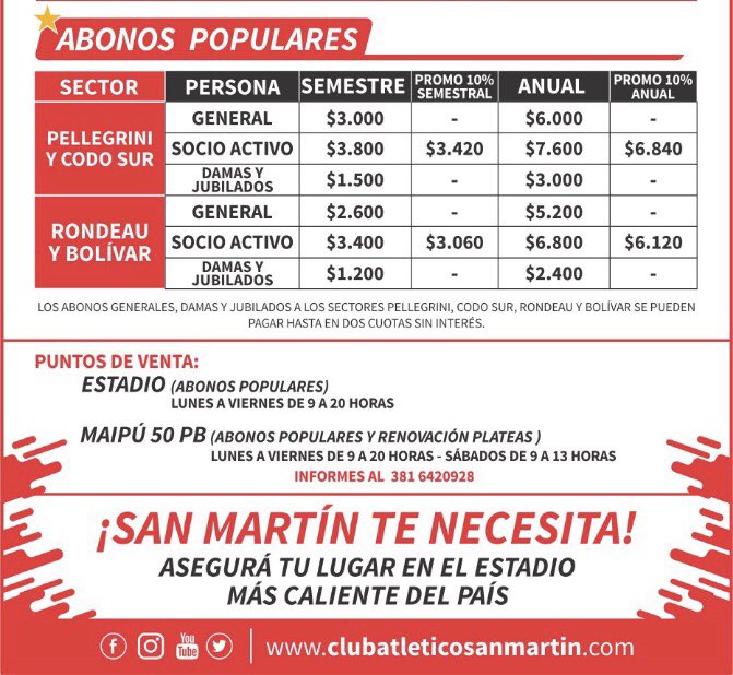 En busca de mantener la cantidad de socios con respecto al semestre anterior, o de aumentarla, los directivos de San MartÃn largaron a la venta los abonos populares para la próxima temporada de la Primera Nacional, que comenzará a mediados de agosto.
